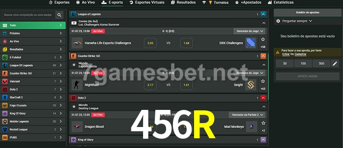 O 456R oferece uma grande seleção de opções de apostas em e-sports com probabilidades competitivas